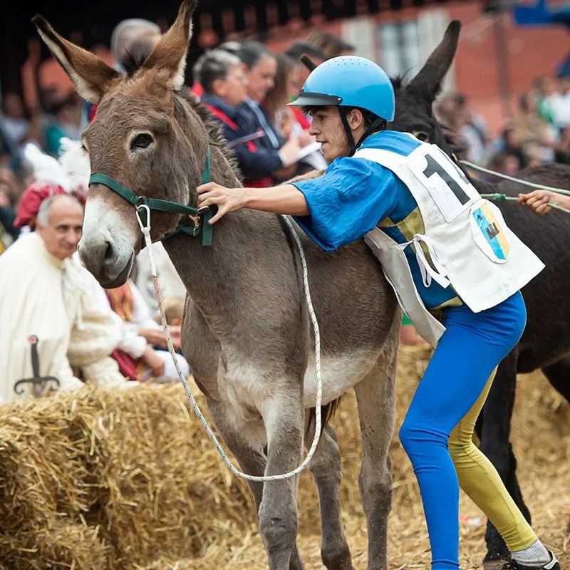 Il giorno successivo, domenica 6 ottobre alle 15:30, attorno alla Cattedrale di San Lorenzo in pieno centro storico di Alba, si corre invece il Palio degli Asini, la pazza corsa di che vede i nove borghi della città sfidarsi per la conquista del drappo. Una giornata goliardica, organizzata nel totale rispetto degli animali, in un’arena piena di colori, costumi, baldanza e tifoserie.